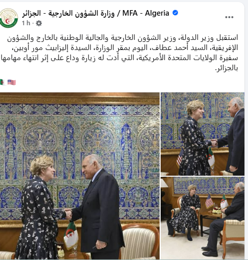 استقبل وزير الشؤون الخارجية، أحمد عطاف، اليوم ، سفيرة الولايات المتحدة إليزابيث مور أوبين، التي أدت له زيارة وداع على إثر انتهاء مهامها بالجزائر، حسب بيان لوزارة الخارجية.