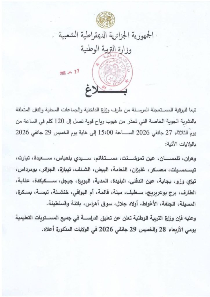 أعلنت وزارة التربية الوطنية تعليق الدراسة في جميع الأطوار التعليمية يومي الأربعاء والخميس 28 و29 جانفي، كإجراء احترازي عقب توقع هبوب رياح قوية قد تصل سرعتها إلى 120 كلم في الساعة.