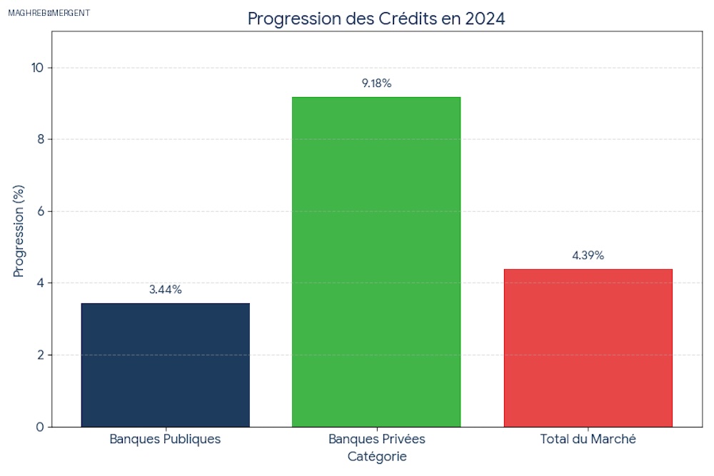 Les banques privées, en revanche, avancent seules, sur un terrain beaucoup plus étroit. Elles n’interviennent que dans le privé, un choix qui n’en est pas vraiment un puisqu’elles n’ont aucun accès au secteur public. Leur poids reste donc limité, à peine 16,6 % des encours totaux. Pourtant, en 2024, elles affichent une progression plus vive que les banques publiques, avec une hausse de 9,18 % de leurs crédits. Le contraste est là: elles progressent plus vite, mais sur un périmètre réduit.