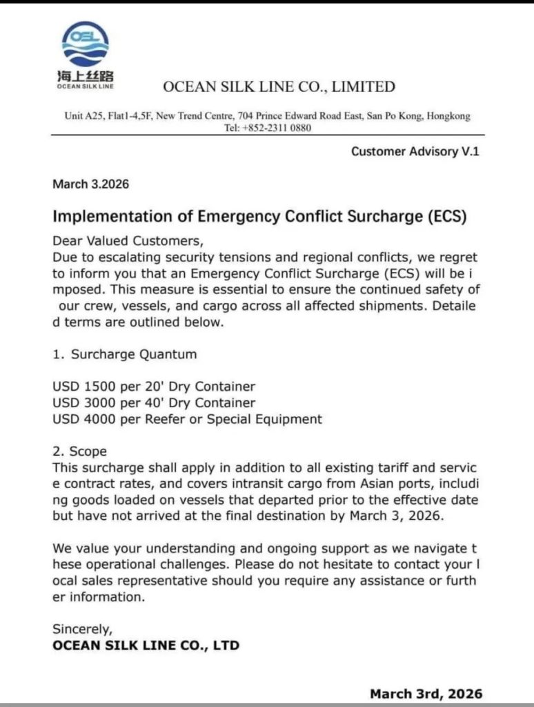 Ocean Silk Line Co., Ltd, armateur basé à Hong Kong, a notifié ses clients le 3 mars d’une « Emergency Conflict Surcharge » (ECS) applicable à l’ensemble du fret en transit depuis les ports asiatiques : 1 500 dollars par conteneur de 20 pieds, 3 000 dollars par unité de 40 pieds, 4 000 dollars pour les conteneurs réfrigérés et équipements spéciaux. La surtaxe couvre les nouvelles réservations comme les marchandises déjà en mer n’ayant pas encore atteint leur destination finale au 3 mars.